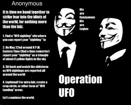 Члены международной хакерской сети Anonymous опровергают появившуюся в Сети информацию о том, что обладают сведениями о существовании жизни на других планетах. «Anonymous сообщили, что имеют информацию об НЛО? Мы не обладаем такими сведениями. Это новость для нас!», – сообщил один из активистов движения. «Мы собираемся опубликовать информацию об инопланетянах? Это все ерунда! Чертовы хиппи…», – написал в Twitter другой хакер. Тем временем, ведущий радио-шоу The Church of Mabus, а по совместительству исследователь инопланетной жизни и паранормальных явлений Джеффри Притчетт (Jeffery Pritchett) считает, что Anonymous не должны смеяться над этой темой.