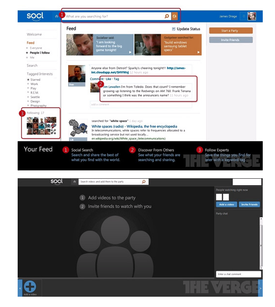 Согласно последним данным, Microsoft собирается запустить свой собственный социальный проект — сеть, известную как Socl. Сообщается, что Socl будет напрямую конкурировать с Facebook и Google+. Просочившиеся в Сеть скриншоты дают понять, что проект будет использовать поисковую функциональность Bing (например, для того, чтобы пользователи могли быстро найти нужную информацию, используя ключевые слова, при этом поисковые запросы могут быть использованы и как статусы пользователя). Поисковая функция является одной из основных особенностей нового сервиса.