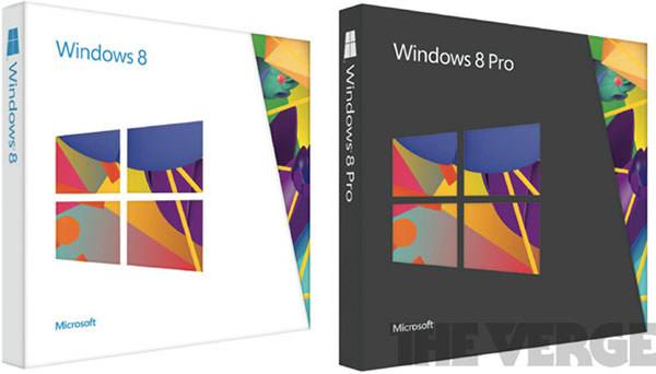 Ресурс The Verge опубликовал изображения коробок для двух доступных в рознице версий новой ОС — Windows 8 и Windows 8 Pro. Microsoft решила использовать простое и ясное оформление коробок, где большую часть занимает одноцветная плоскость с новым логотипом Windows на ней, обыгрывающем окошко. Светлая версия коробки принадлежит изданию Windows 8, а тёмная — Windows 8 Pro.