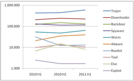 На диаграмме показано соотношение отдельных категорий вредоносного ПО за несколько последних полугодий. В группе троянских программ отмечен значительный рост в первой половине 2011 года, он продолжается и сегодня. В эту группу входят все программы, выполняющие конкретные вредоносные функции. Большинство троянов содержат программы, загружающиеся на зараженные компьютеры в обход системы, чтобы осуществлять свои злостные действий. В эту группу входит спам, атаки, приводящие к отказу сайта обслуживать законных пользователей, прокси-сервисы и другие подобные «предложения» из списка «услуг» киберпреступников. Также в эту группу попадает множество версий банковских троянов ZeuS и SpyEye. Этот рост показывает, что бизнес в компьютерном подполье процветает.