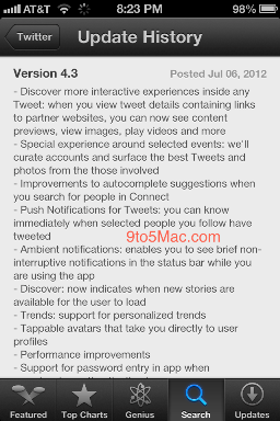 В Twitter 4.3 пользователи смогут просматривать превью сообщений, содержащих ссылки на партнерские веб-сайты, включая изображения и видео, устанавливать Push-уведомления на конкретных пользователей, просматривать «ненавязчивые» короткие уведомления в статус-баре, а также переходить на страницу пользователя при нажатии на его фотографию.