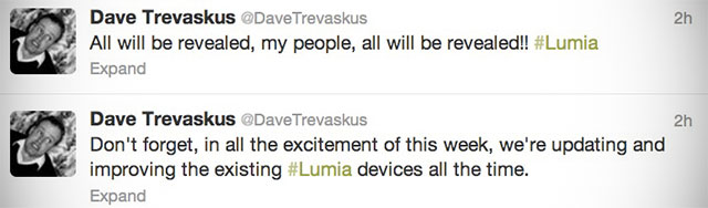 Возможно, владельцам таких устройств ждать осталось не так уж долго — старший учебный консультант Nokia Дейв Треваскус (Dave Trevaskus) написал в микроблоге: «Следя за всеми впечатляющими анонсами на этой неделе, не забывайте, что мы постоянно обновляем и улучшаем существующие смартфоны Nokia Lumia». Затем отдельной записью он добавил: «Всё будет показано, мои друзья, всё будет показано!!».