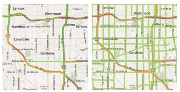 Для демонстрации уровня загруженности дорог Bing Maps использует стандартный метод кодирования цвета: