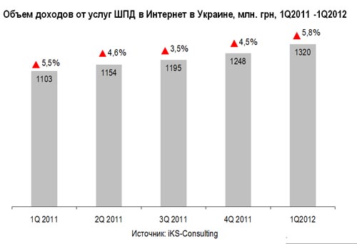 iKS-Consulting по результатам первого квартала 2012 года оценил объем доходов от услуг широкополосного доступа в 1,32 млрд. грн. (без НДС) – рост по сравнению с предыдущим отчетным периодом составил 5,8%. По сравнению с 1Q2011 года объем доходов увеличился на 20%.