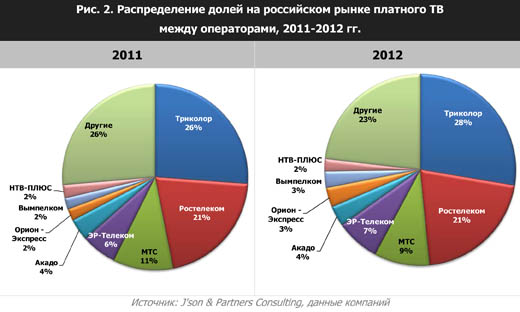 Крупнейшими игроками на рынке платного ТВ России по итогам 2012 года являются «Триколор ТВ» (доля рынка 28%), «Ростелеком» (21%), МТС (9%), «ЭР-Телеком» (7%) и «АКАДО» (4%).