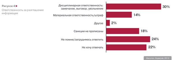 Правда, 53% компаний сообщили, что NDA у них применяется. Но какие санкции предусмотрены за разглашение информации сотрудниками, подписавшими NDA? Респонденты называют всё те же штрафные и дисциплинарные (выговоры, «разъяснительные» беседы) санкции. Нередко упоминается увольнение. Однако и такая, казалось бы, очевидная мера применяется лишь примерно в трети случаев. При этом чаще всего работник уходит из компании «по собственному желанию». В некоторых случаях (18%) респонденты признаются, что инсайдеры не понесли вообще никакого наказания, к ним не могут применить санкции: «В итоге — никакие… Сложно доказать вину конкретного человека».