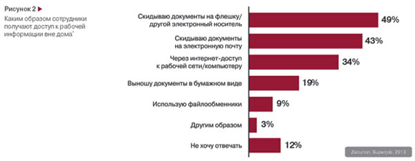 В Zecurion отмечают, что уже даже сам характер обращения с данными в корпоративной среде угрожает их безопасности. Только треть (32%) офисных сотрудников никогда не работает с корпоративной информацией, а 23% персонала, напротив, делают это постоянно, несколько раз в неделю. Всего же с корпоративной информацией вне офиса работает с той или иной периодичностью 54% сотрудников.