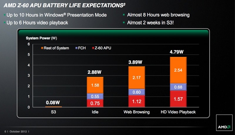 AMD сообщила, что Z-60 Hondo использует 40-нм архитектуру Brazos, потребляет до 4,5 Вт и позволяет создавать конфигурации толщиной корпуса в 10 мм с поддержкой Windows 8 и разрешения экрана до 1920х1200.