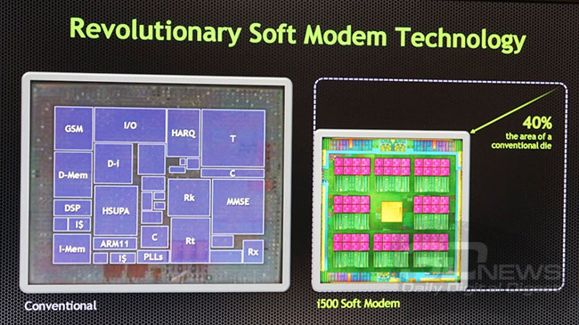 Icera i500 — это программный модем, в котором вычислительные блоки вынесены во внешний чип (в данном случае — Tegra 4). Он очень энергоэффективен благодаря 28-нм техпроцессу и существенно меньшей площади кристалла по сравнению с обычными модемами. Чип i500 состоит из 8 отдельных ядер, каждое из которых может отключаться для экономии энергии. Изначально он будет относиться к категории 3 LTE, что сделает возможным максимальную скорость скачивания до 100 Мбит/с. Позже NVIDIA выпустит программное обновление, которое переведёт модем в категорию 4 LTE, обеспечив скачивание на скорости до 150 Мбит/с. Чип также будет поддерживать VoLTE.