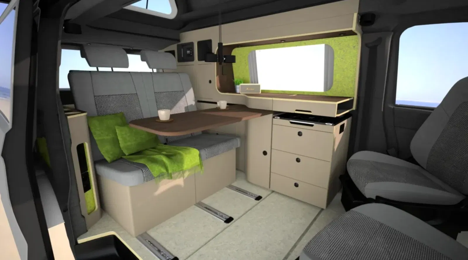 Верхнє спальне місце має розміри 200 × 140 см. Нижнє ліжко, яке складається зі складених сидінь, має розміри 200 × 100 см. Загальна місткість — чотири особи. Усередині фургона на підлозі встановлено напрямні, що дозволяють переміщати кухонний блок з індукційною плитою та раковиною. Блок можна висунути назовні через розсувні двері або зафіксувати в центрі салону для використання як робоче місце.