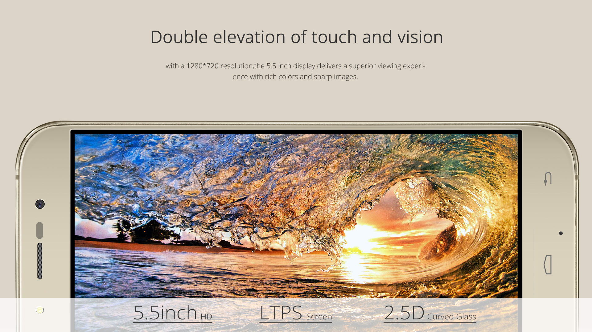 При создании данного смартфона производитель пошел проверенным путем и установил большой дисплей с диагональю 5,5 дюймов. Такой диагонали достаточно для работы с текстом, для просмотра фильмов или игрушек. Разрешение, правда, не FullHD, а просто HD, но картинка все равно четкая, яркая и очень сочная. Основная камера на 8 мегапикселей основана на матрице Sony IMX179, программным путем можно поднять разрешение до 13 мегапикселей. Работает на операционной системе Android 5.1 Lollipop, обновления до шестой версии пока что не планируется.