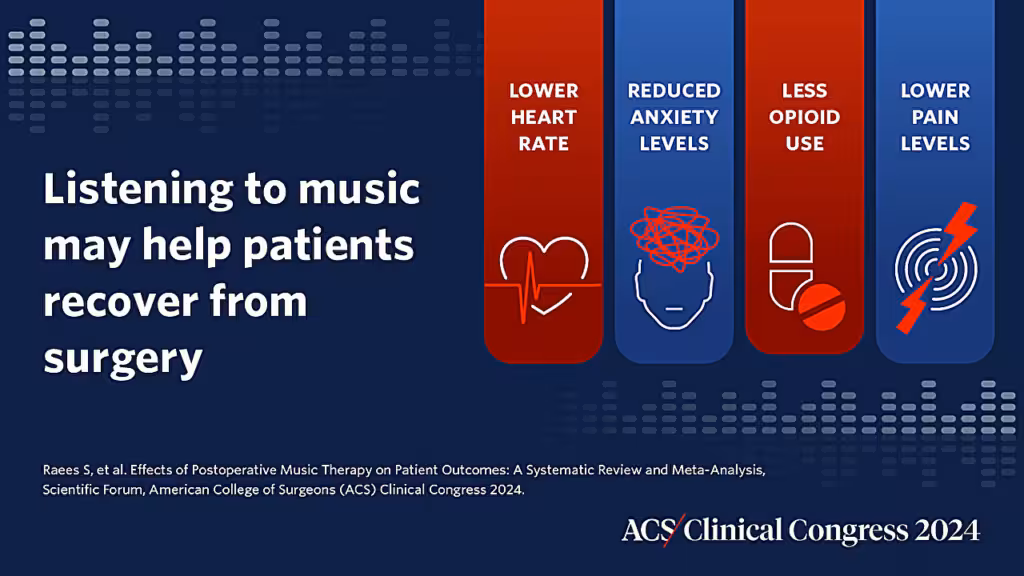 Метааналіз виявив, що прослуховування музики в навушниках або через динаміки сприяло якнайшвидшому відновленню після хірургічних процедур. Зокрема, пацієнти, які отримували музичну терапію, наступного дня менше страждали від болю. Оцінка за допомогою числової рейтингової та візуальної аналогової шкал показала зниження болю на 19% та 7% відповідно.
